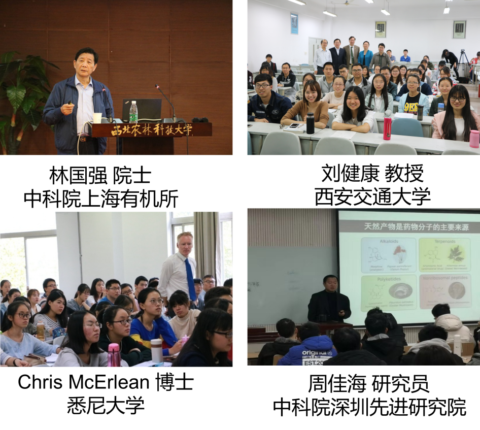 课程组授课方式是本课程的特色之一,由从事天然产物化学科学研究的若干位教师共同承担,在授课过程中,结合自身的科研实践,在讲授基本知识的基础上,引导激发学生对该研究领域的最近研究进展的思考,拓宽了学生的科研思维,教学效果良好。角色互换也是本课程的特色之一,2017年以来,从查阅、研读文献,到制作PPT,上台汇报,回答评委的提问的整个过程,每位学生均独立完成,真正做到一人一题,在这一过程中,锻炼了学生的科研素养,进一步激发了学生对《天然产物化学》(植物化学)的学习热情。经过多年的探索,形成了一套《天然产物化学》翻转课堂的独特模式。本课程还将定期邀请国际知名专家来校讲学,2018年,中科院院士林国强先生的专题讲座“中药草本与手性药物”,在学生中引起了极大的反响;又如2017年,由西安交通大学刘健康教授与本团队负责人以“双师协同” 的授课方式为2014级应用化学专业本科生联合讲授“特殊类型生物活性天然产物”。此外,应邀为本科生授课的国内外专家还包括澳大利亚国立大学Martin G. Banwell 院士、悉尼大学的Chris McErlean 博士、中科院深圳先进技术研究院周佳海研究员、四川大学王锋鹏教授、等应邀为本科生授课,以上活动均取得了良好的效果(图3)。