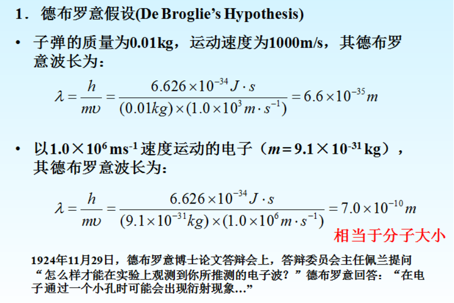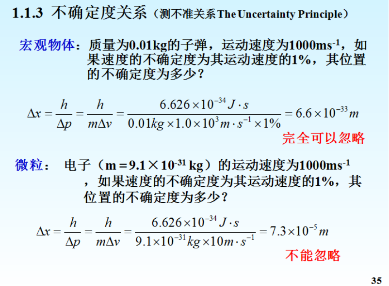 “波粒二象性”导致微观粒子就有可量化的波长,必然结果是“测不准原理”,即:测量的位置误差和动量误差的积的下限是普朗克常数);类似还有。“测不准原理”推演子弹和“电子子弹”的结论与“波粒二象性”结论一致:宏观物体的波动性可以忽略不计,但微观体系的波动性表现尤为突出(详见上图左二)。