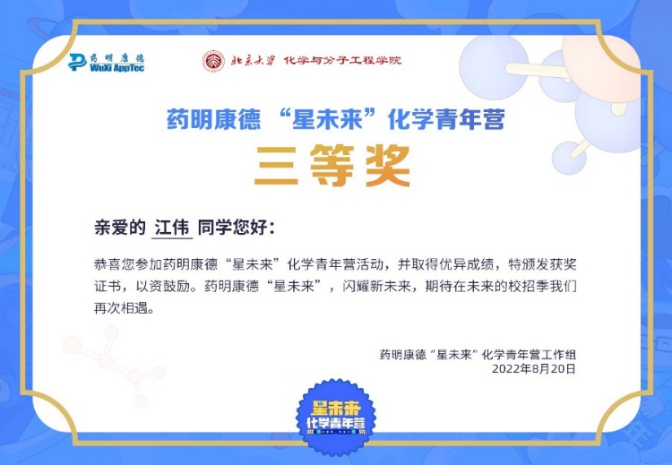 近日,海棠书屋 谢卫青教授课题组2021级博士研究生江伟同学在药明康德举办的第五届“星未来”化学青年营活动中荣获三等奖。