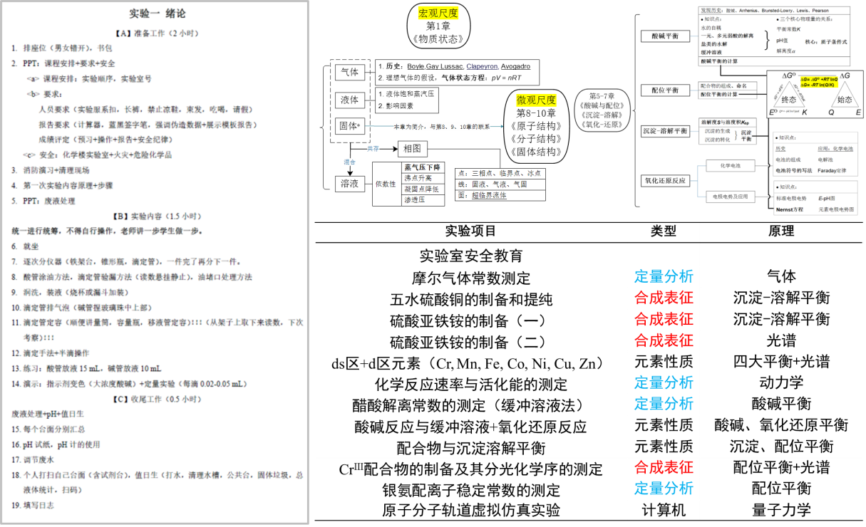 图2 左:实验课的教案(含操作步骤量化标准、重点与难点、时间节点、本次考核要点等);右:化学原理部分章节知识脉络及与化学原理实验之间的关联。