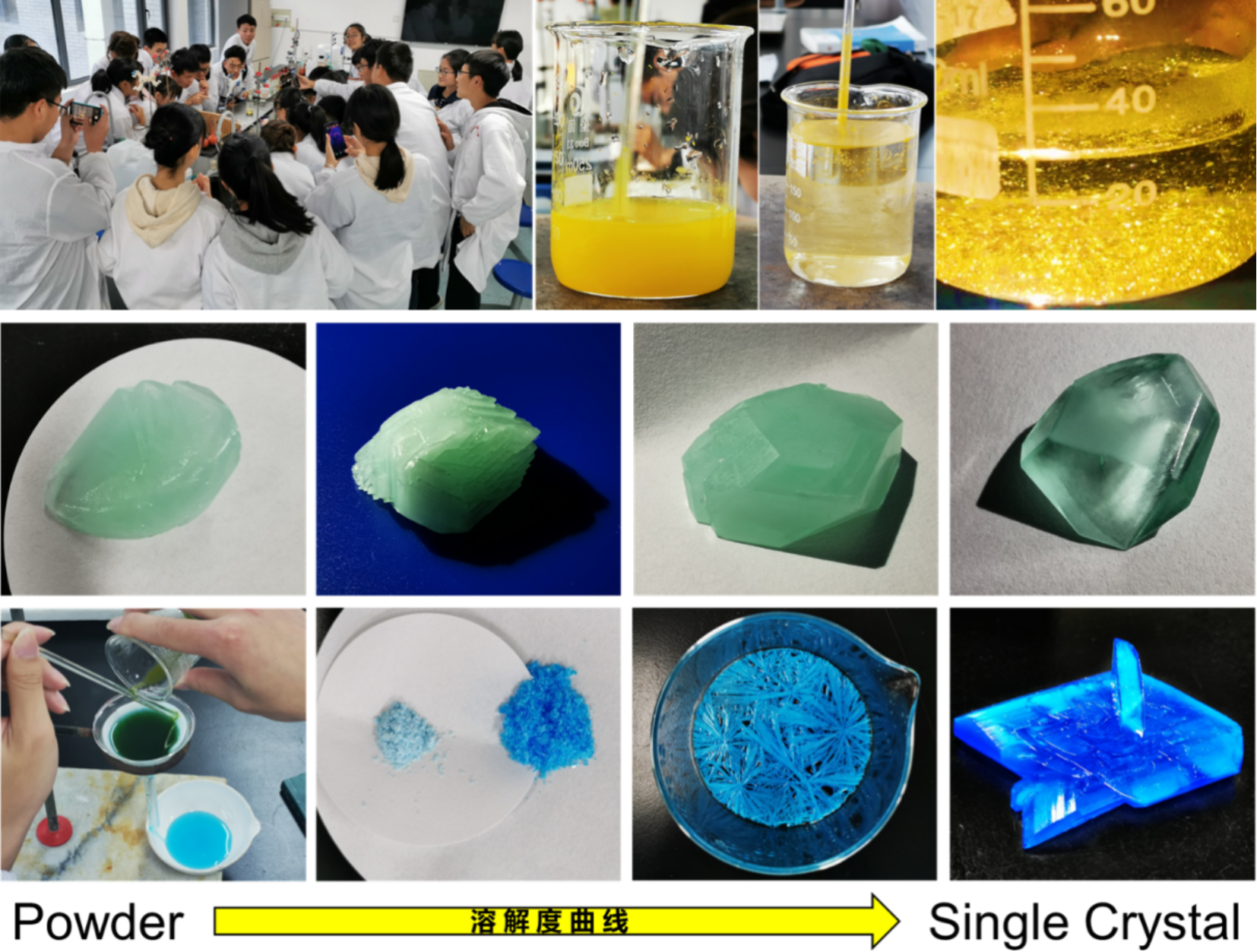 合成实验定量制备;这类实验过程环环相扣,学生总怕“一步走错”,引起“满盘皆输”。但该类实验又具有极强的视觉冲击力,所以格外受学生追捧。其中,三个单晶的制备实验——“黄金雨”碘化铅、“蓝宝石”五水合硫酸铜、“绿宝石”七水合硫酸亚铁铵——尤为引人关注。海棠书屋 21级03、04班有不少同学还曾多次主动申请利用课外时间重复实验。该类实验的核心是利用化合物溶解度曲线,通过精细调控溶质浓度、溶液体积、冷却和溶剂挥发速度等因素,实现纳米晶、粉末多晶或针、块状单晶体的培养。课堂中,除去让同学去搜集不同晶体在军民领域的用途外,我们还组织学生汇集产品做“晶体选美”大赛。并对于各尺寸、形状、品相的晶体逐一分析,定量讨论晶体生长的更优方案。毕竟“培养晶体不是撞大运,更不是玄学,能够重复和重现的才能被称为科学实验”。