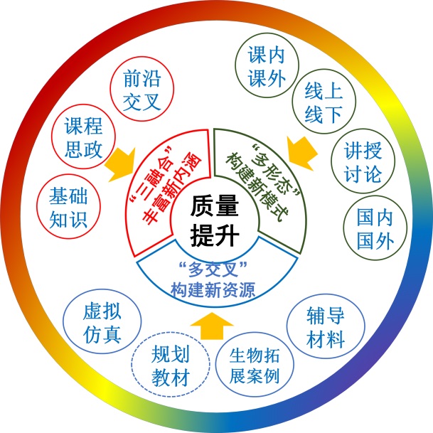 有机化学(农林生物类or全英文)课程对生物类学生后续专业课程的学习起着重要的作用,同时为后续相关学科前沿研究分子机制理解与探索提供必要的知识与理论支撑,所以此门课程被赋予更多的“强基”使命。在前人建设基础上,课程组及本人瞄准有机化学为农林生物专业“奠厚基”的任务,实施“育人为本、德育为先”的指导思想,突出化学与农林生物等科学的密切交融,思政-基础-前沿融合更新教学内容,推动多形态混合教学,强化课程、辅助材料等优质资源建设(图1)。